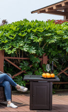 Legacy Heating 50,000 BTUs Fire table , nice looking mocha design on base, color matches dark brown color family furniture, used as a fire pit, meanwhile also can be applied as a bistro table with the lid added to the fire bowl.The table frame is protected from the elements by a dark brown finish and designed with table look. A standard 20-lb. liquid propane tank (stored inside the table; tank not included)is all you need to produce up to 48,000 BTUs of warmth from the stainless steel burner. A bag of lava rock is included to help conceal the burner and a matching dark brown lid lets you use the surface as a table during warmer months.Easy access door for propane tank exchange, 20lb standard gas tank for usage. (not included).Sit back, relax and enjoy time together with family and friends with the perfect propane fire pit table addition to the backyard, patio, deck, or fire pit table with auto-ignition conveniently conceals a standard 20-Lb propane tank (not included) within its base.Enjoy an elegant accent to your stainless steel burner, or cover the burner and have an attractive table to entertain your guests.