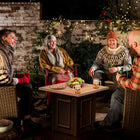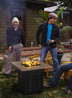 Legacy Heating 50,000 BTUs Fire table , nice looking mocha design on base, color matches dark brown color family furniture, used as a fire pit, meanwhile also can be applied as a bistro table with the lid added to the fire bowl.The table frame is protected from the elements by a dark brown finish and designed with table look. A standard 20-lb. liquid propane tank (stored inside the table; tank not included)is all you need to produce up to 48,000 BTUs of warmth from the stainless steel burner. A bag of lava rock is included to help conceal the burner and a matching dark brown lid lets you use the surface as a table during warmer months.Easy access door for propane tank exchange, 20lb standard gas tank for usage. (not included).Sit back, relax and enjoy time together with family and friends with the perfect propane fire pit table addition to the backyard, patio, deck, or fire pit table with auto-ignition conveniently conceals a standard 20-Lb propane tank (not included) within its base.Enjoy an elegant accent to your stainless steel burner, or cover the burner and have an attractive table to entertain your guests.