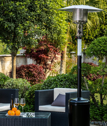 47,000 BTUs Powder coating finish provide antique look. This multi-purpose heater is ideal for use on your patio, restaurant, pool deck, or for a party, wedding, or any outdoor event (patio heaters are not for use indoors, near combustible materials, or in partially enclosed outdoor areas such as tents.Traditionally unit suit for every family.Piezoelectric ignition. Safety auto shut-off tilt valve.For enhanced safety and peace of mind, the heater also features a shut-off tilt valve that turns the heater off automatically if it gets tipped over. Wheel assembly included.A wheel assembly with two smooth-rolling wheels comes included, making it easy to transport the outdoor heater from poolside to patio or from one side of the deck to the other. A nice alternative to a fire pit, the gas patio heater delivers quiet, soothing, consistent heat with no smoke or open flames to worry about.The perfect item for cold, romantic evenings.All accessories required for use are provided in the box, including wheels, heavy-duty propane gas regulator and a pre-attached flexible hose.Conceals a standard 20-Lb propane tank within its base.Customers need to standard 20 lb. propane tank(not included).